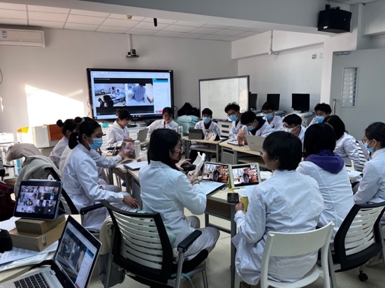 课间休息时,同学们在助教的协助下体验各种肢具的使用,将理论与实践结合,有效提升学生的临床应用能力。课程结束前,各组指导老师与同学们沟通了此次线上情景模拟的感受、建议与意见,对同学们提出的问题进行了细致全面的解答。同学们纷纷表示此次线上线下结合的模拟教学模式新颖,教师不在教室内还减轻了同学们的紧张感,情景模式时沉浸感会更强,教学效果良好。