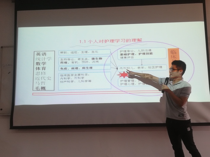 接着靳帅介绍了自己从本科生到研究生的学习过程。他强调要学会进行广义的护理学习,包括学生工作、交流实践和科研学术三个方面,而不仅仅局限于书本上所讲述的知识。首先谈到学生工作,靳帅在本科期间分别担任过班长、学习部部长、学生助理和党支部书记等职务。在每项职务上他都是严于律己、真诚待人、敢想敢做的,如他在担任bwin必赢官网学生党支部书记时曾组织举办数次参观交流实践活动,规模之大、人数之多,是前所未有的。
